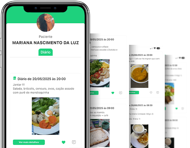Além do meu suporte pelo Whatsapp, você tera um chat exclusivo dentro do App para tirar suas dúvidas e também fazer o acompanhamento total da sua dieta, como horários, porções e variações.